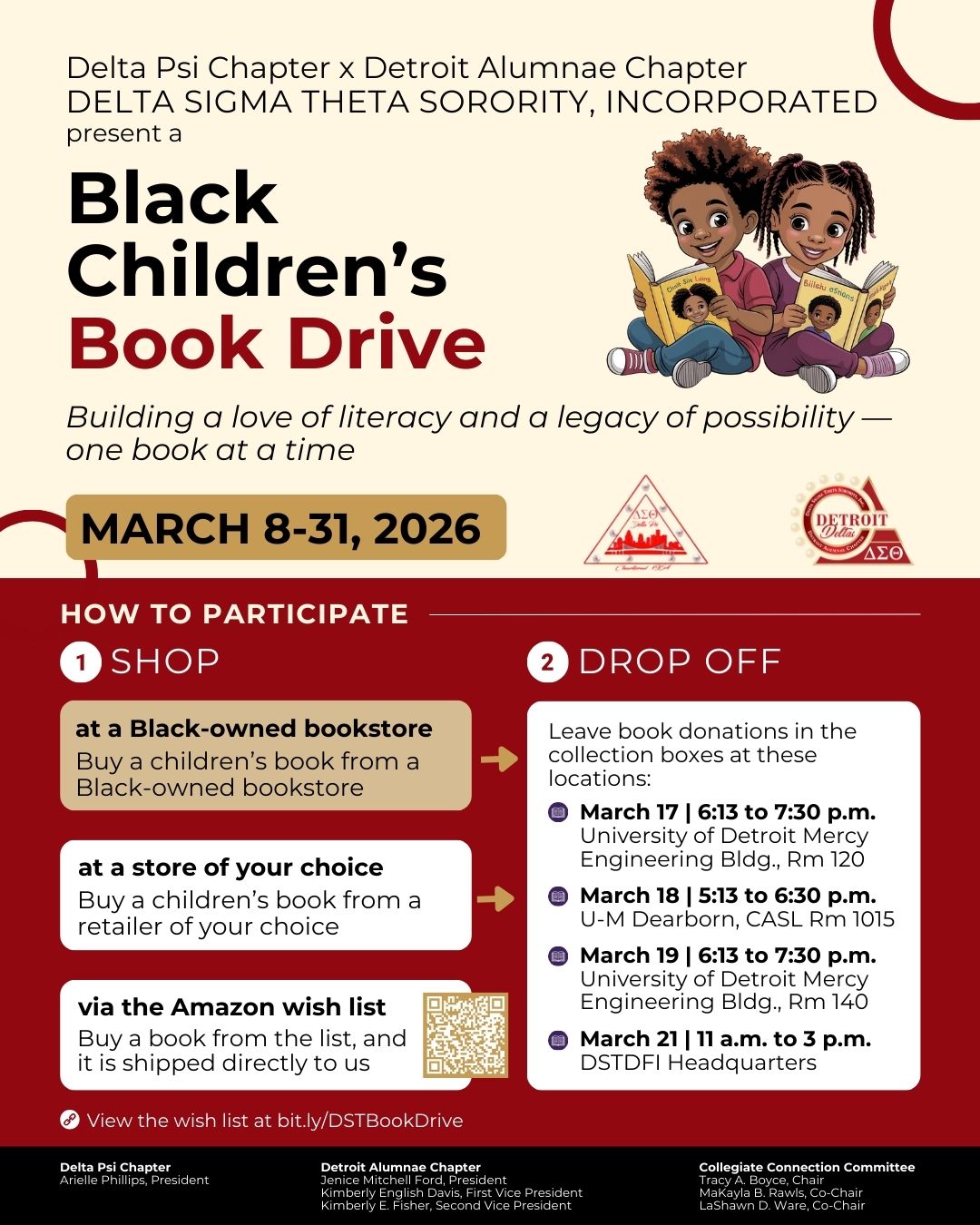 In honor of National Reading Month, the Detroit Alumnae and Delta Psi chapters of Delta Sigma Theta Sorority, Inc. are proud to collaborate on collecting Black children’s books for a DPSCD elementary school library. All young readers deserve to find themselves on the page.