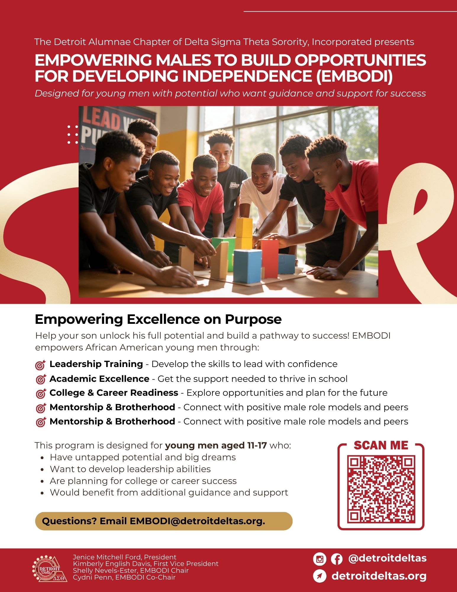 Happy New Year! Our first meeting for EMBODI, young men and their parents, is Sun., Jan. 18 @ 3 PM at DSTDFI, 24760 W. Seven Mile Rd, Detroit 48240. Register by Sat., Jan. 10 to participate as we bring Black men together to build opportunities and develop independence! Go to bit.ly/EMBODI2026Kickoff or the QR code on the flyer.